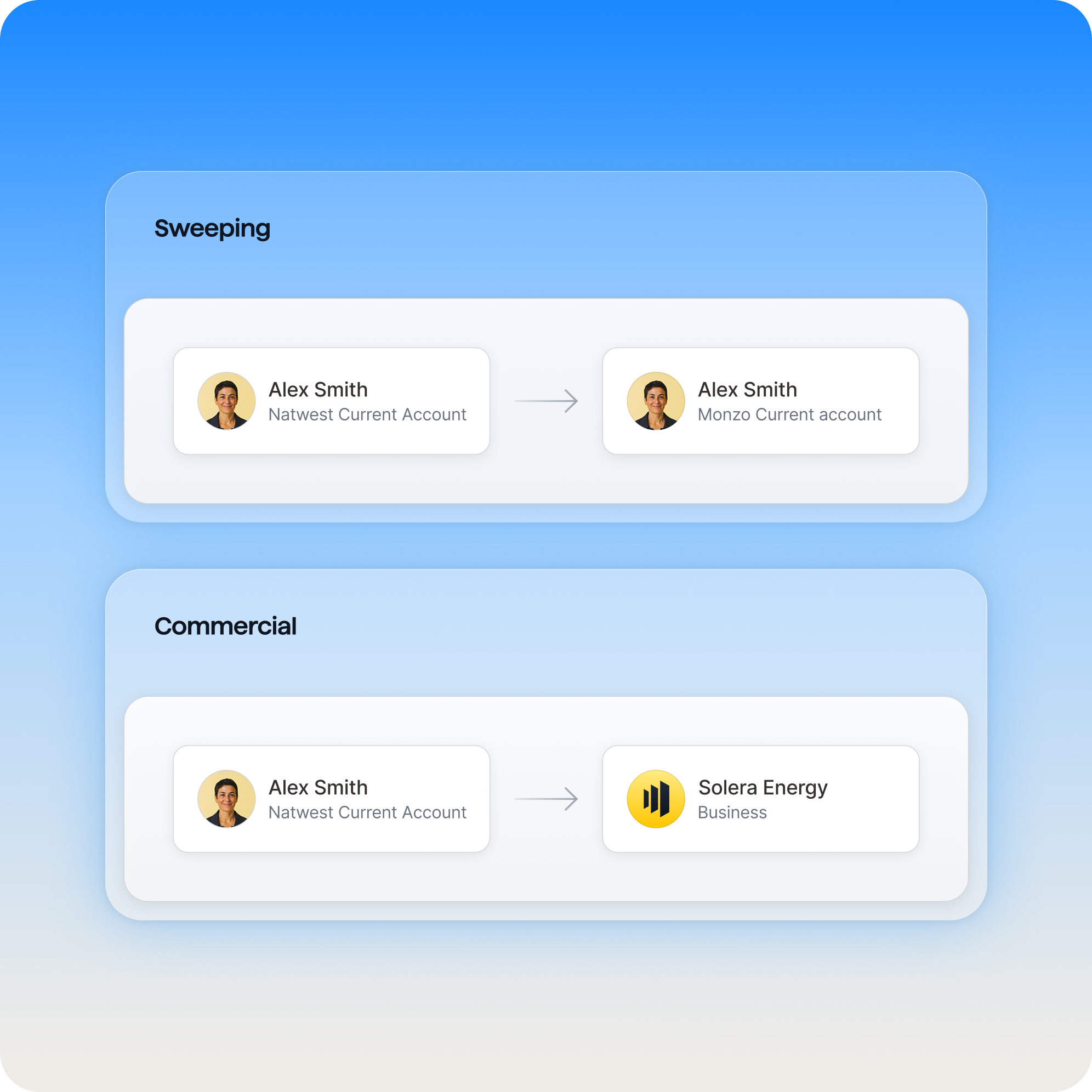 Sweeping: The automatic transfer of money between two accounts belonging to the same person - often called ‘me-to-me’ payments.