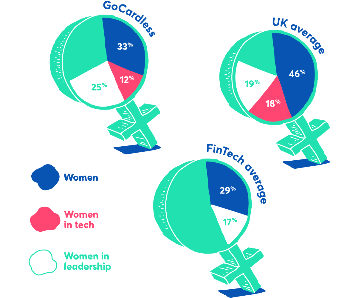 We have some work to do on gender diversity. We’re above the UK average for women in leadership, but behind UK averages for total percentage of women at GoCardless and women in tech roles.