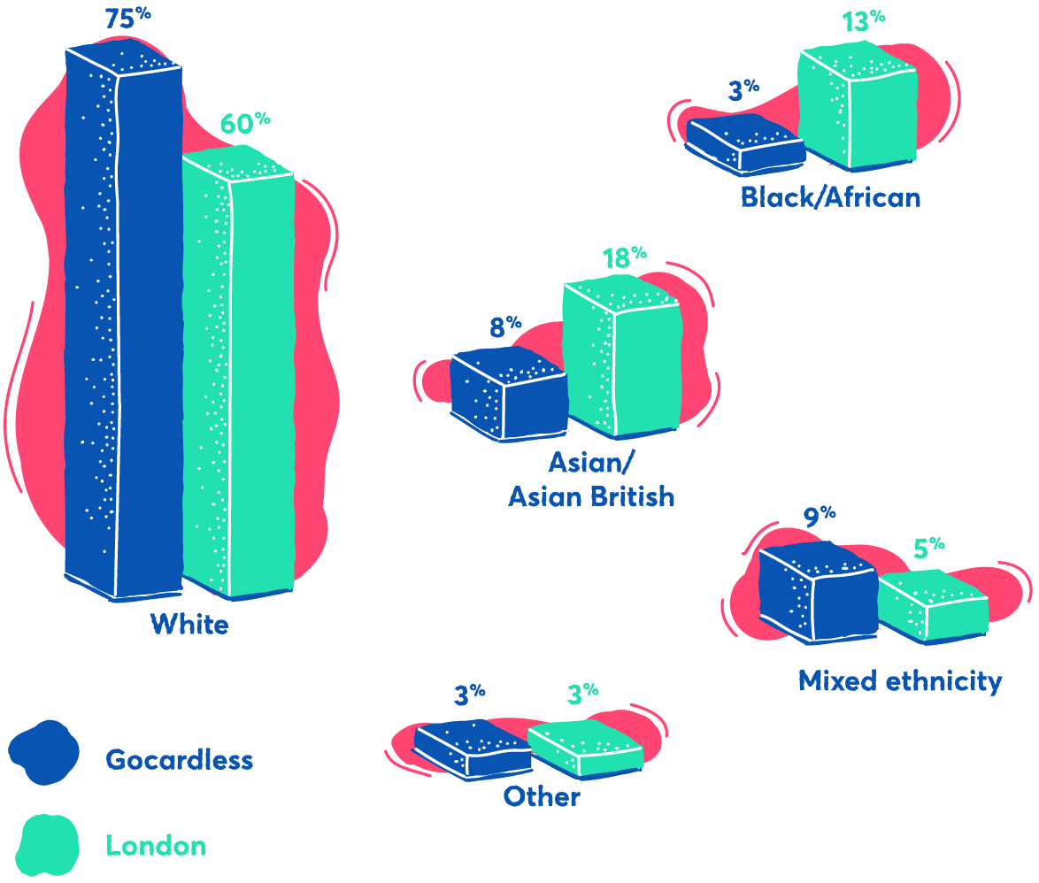 9% of GoCardless people identify as LGBTQ, compared to the UK benchmark of 4% (source: ons.gov.uk, May 2018).