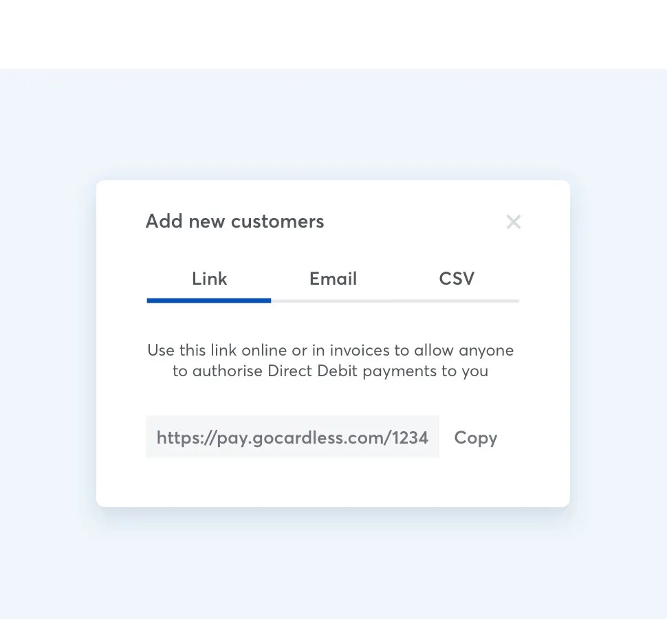 Før du kan begynde at modtage betalinger, skal dine kunder udfylde en formular til direkte debitering. Det er let at invitere dine kunder til GoCardless. Brug e-mail eller et link, som du kan bruge på dit websted, eller indsæt det i fakturaen.