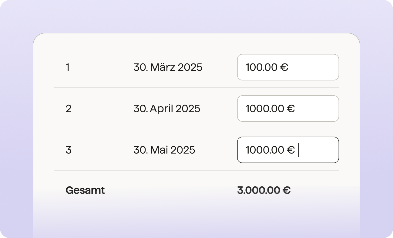 Mit GoCardless können Sie einen Betrag in gleiche Raten aufteilen, zum Beispiel 3.000 € über drei Monate zu je 1.000 €. Sobald der Ratenplan abgeschlossen ist, werden die Zahlungen automatisch eingestellt.