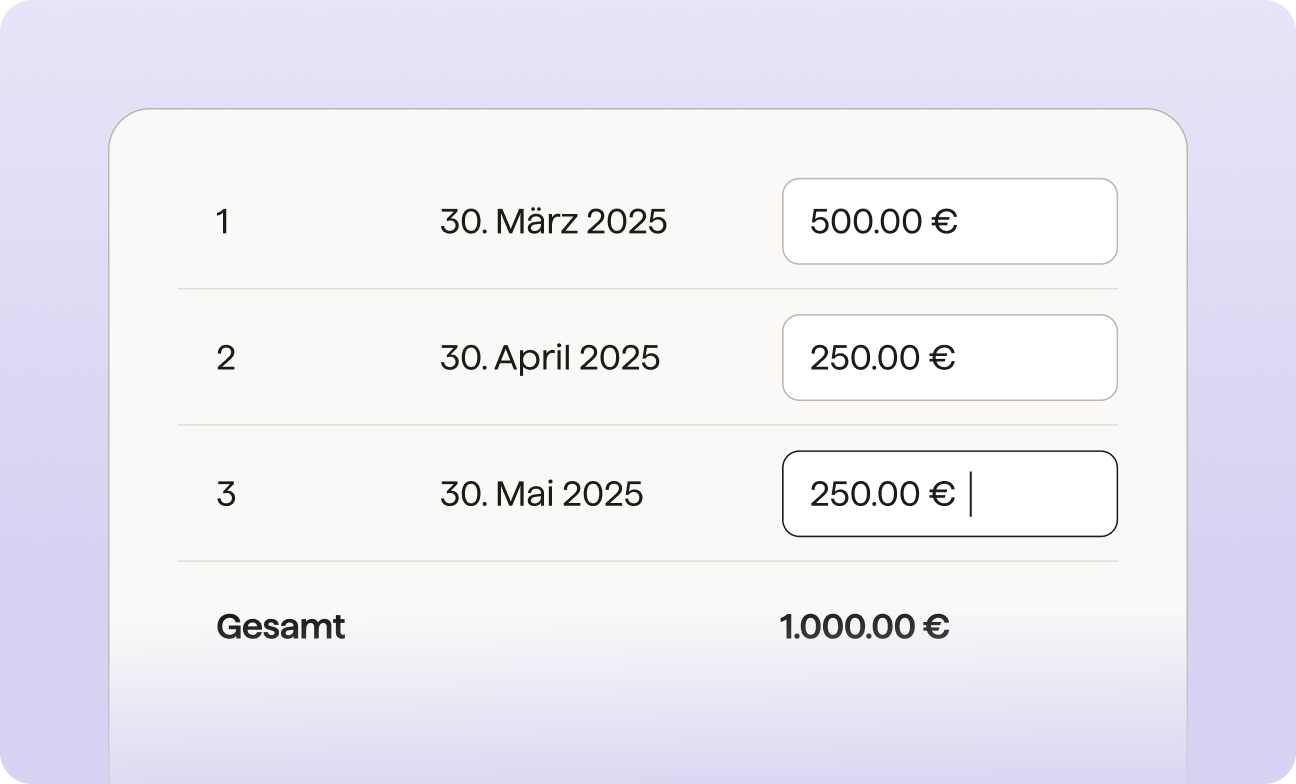 Mit GoCardless können Sie flexible, wiederkehrende Zahlungen einziehen und Ihren Kunden mehr Kontrolle bieten, egal ob wöchentlich, monatlich oder vierteljährlich. Zum Beispiel können Sie 1.000 € auf drei monatliche Zahlungen aufteilen, die erste 500 €, die restlichen je 250 €.