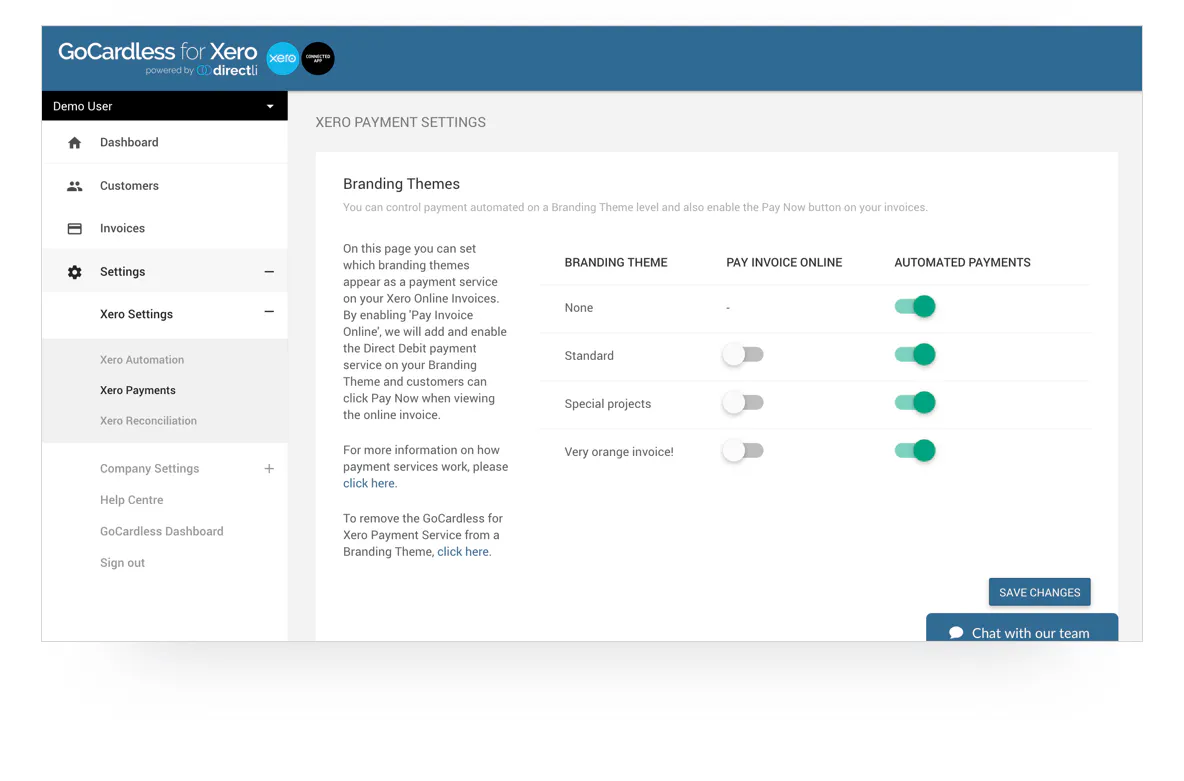 Each time you create an invoice in Xero you can collect the payment automatically by Direct Debit on the invoice due date. Alternatively, you can manually collect payments for specific customers or by Xero branding themes. Collect payments in Euros, British Pounds and Australian, New Zealand or Canadian Dollars.