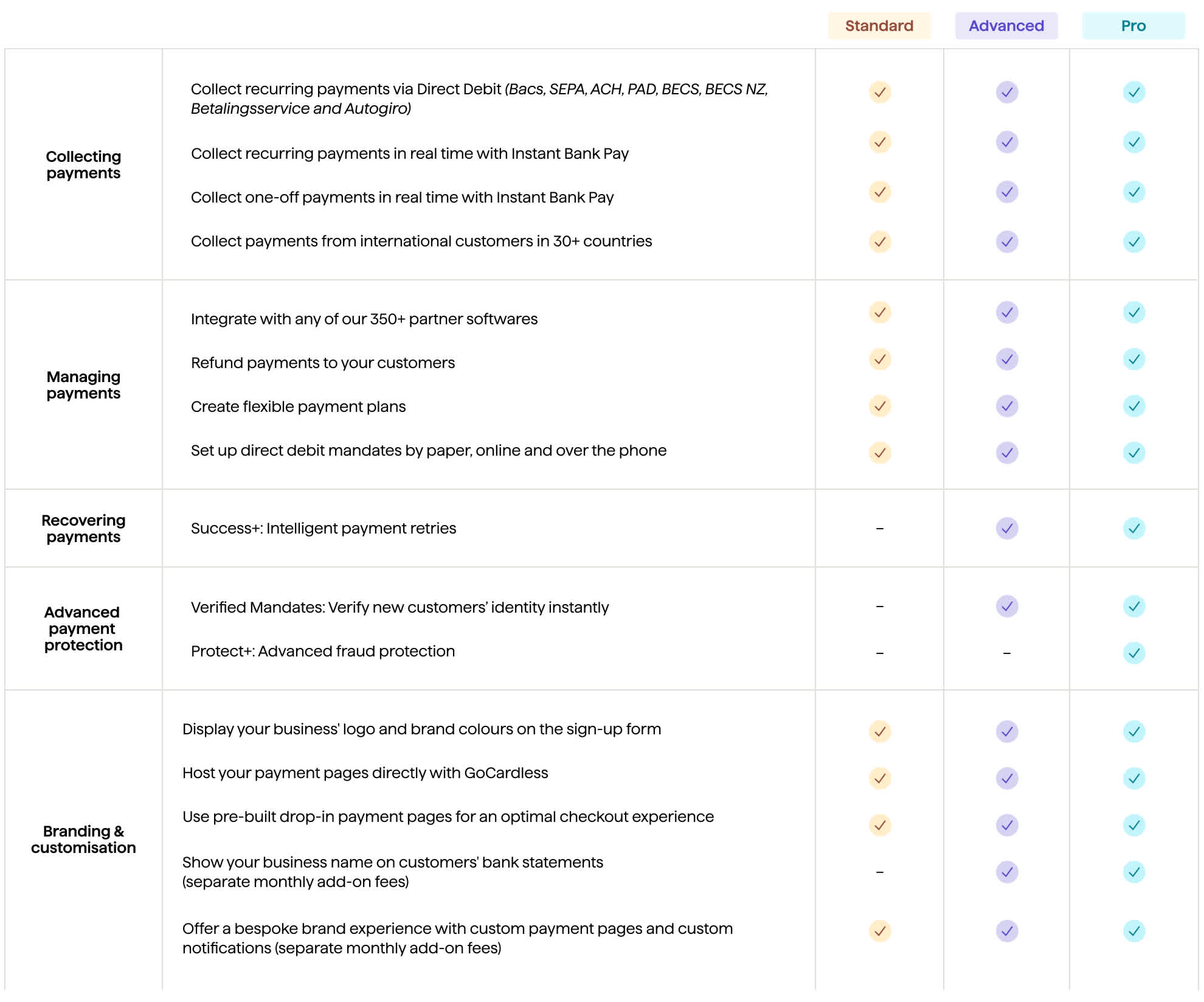 The Standard plan is the ideal option for anyone looking for a simple and straightforward way to collect recurring and one-off payments. With this plan, customers get access to our core capabilities, including: collecting one-off and recurring payments via Direct Debit, or Instant Bank Pay for instant confirmation as well as taking international payments. Additionally, customers also get access to our basic customisation features.
