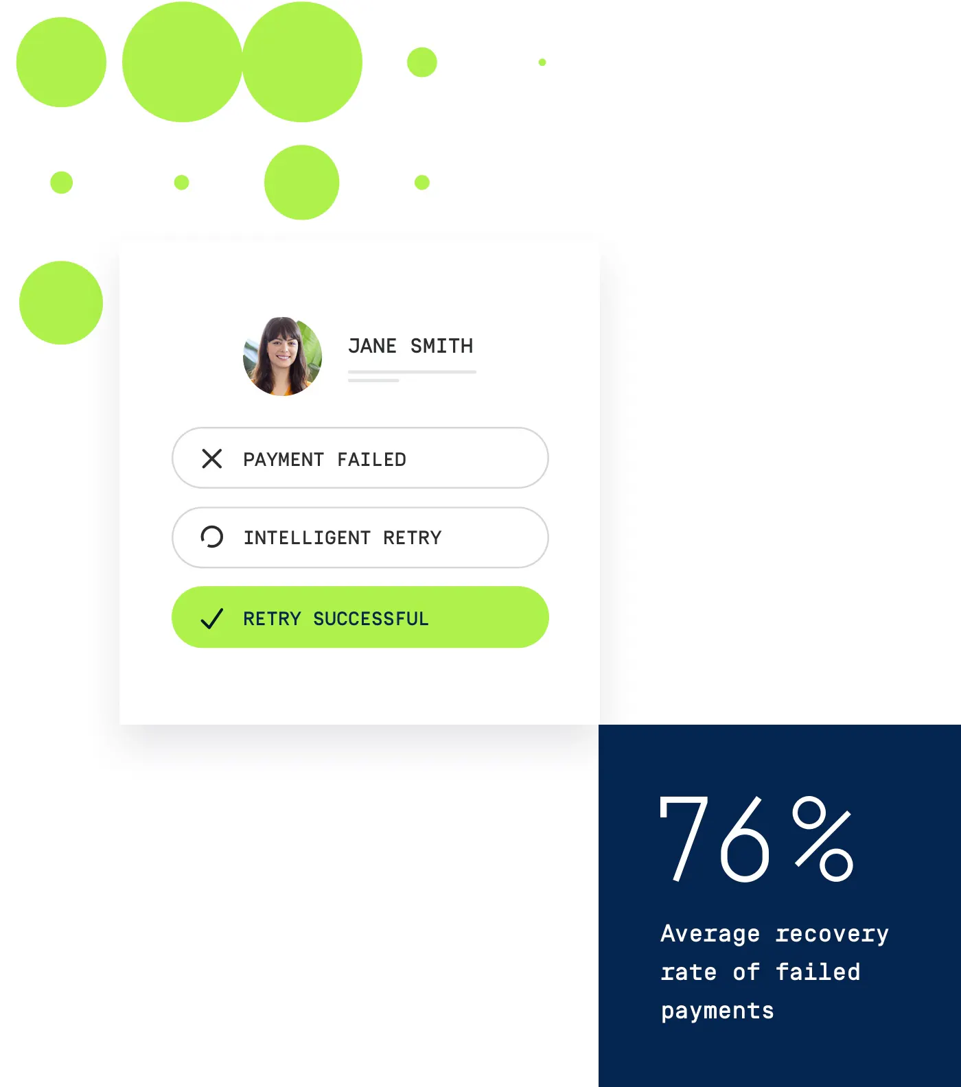 Payment failures sometimes feel like an inevitability, but they don’t have to be. Success+ collects, on average, 76% of payments that initially fail, allowing you to build a better payment experience for your customers.