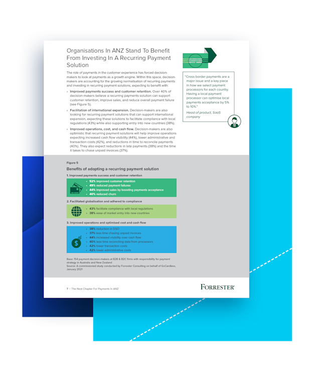 Forrester surveyed 750 payment decision makers in B2B & B2C firms, to evaluate the state of recurring payments across the globe. This spotlight focuses on 154 respondents & 2 qualitative interviews with payment decision-makers from Australia & New Zealand