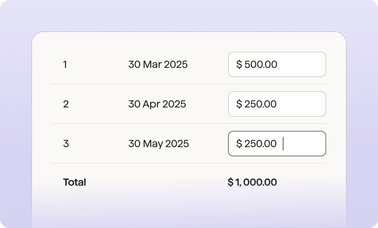With GoCardless, you can break the sum into equal instalments – like paying $3,000 over three months at $1,000 each. As soon as the instalment plan is completed, the payments will be stopped automatically.