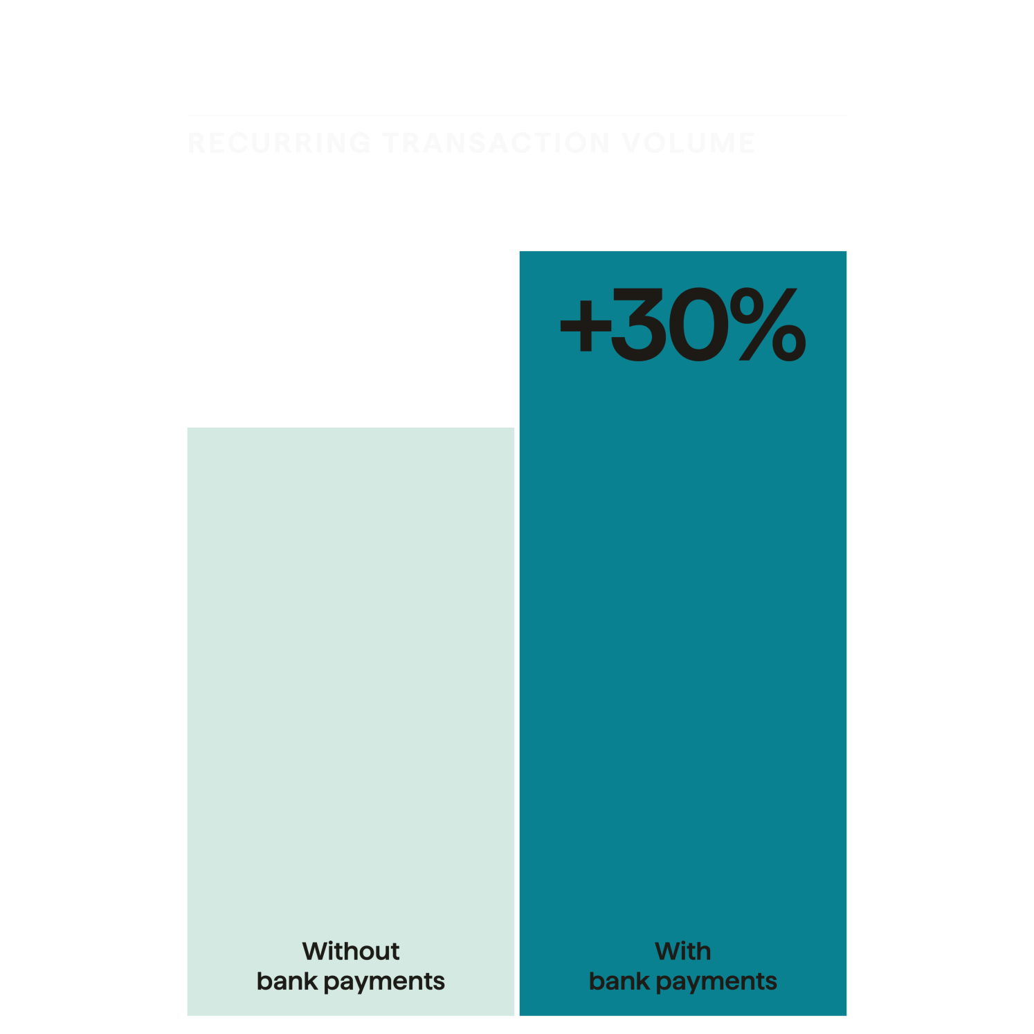 By offering bank payments you’re able to capture a greater share of wallet within your ecosystem, while your customers benefit from lower costs and higher success rates compared to credit cards and digital wallets. Adding bank payments increases recurring transaction volume by 30%*, only complementing your payment offering.
