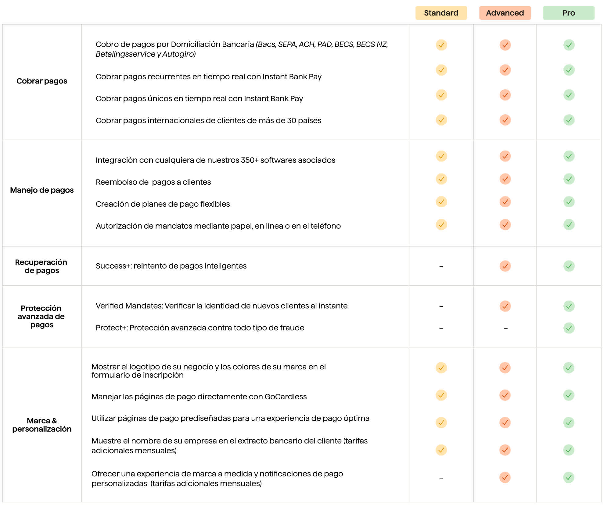 El plan Standard es la opción ideal para cualquier persona que busque una manera simple y directa de cobrar pagos únicos y recurrentes. Con este plan, los clientes obtienen acceso a nuestras capacidades principales, que incluyen: cobrar pagos únicos y recurrentes a través de Domiciliación Bancaria, o Instant Bank Pay para confirmación instantánea, así como también la capacidad de cobrar pagos internacionales. Además, los clientes también tendrán acceso a nuestras funciones básicas de personalización.