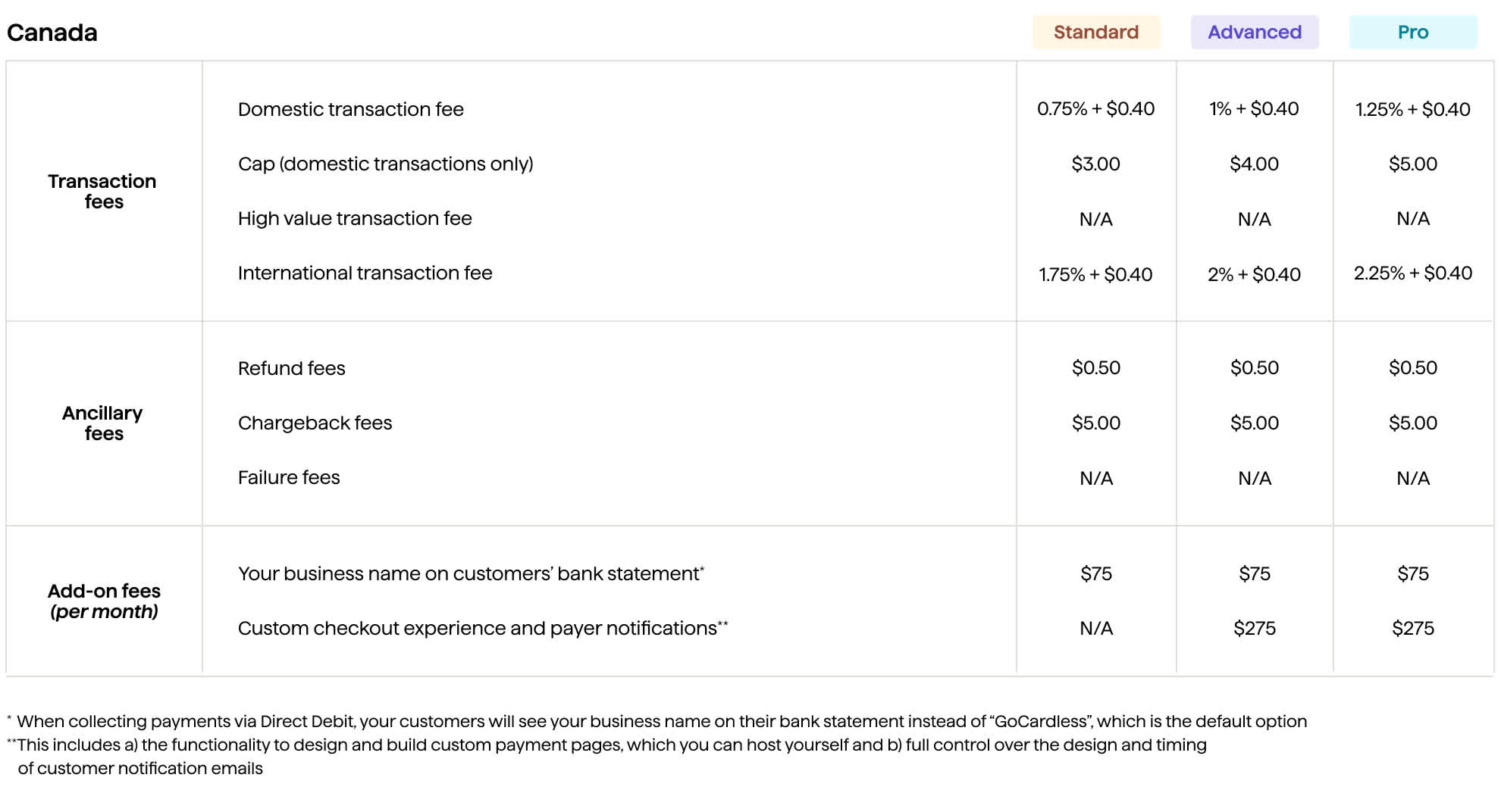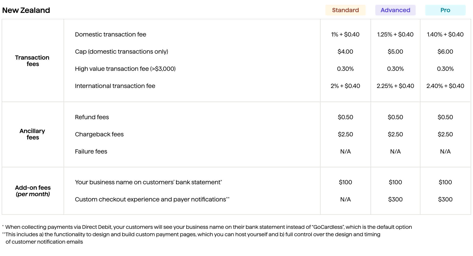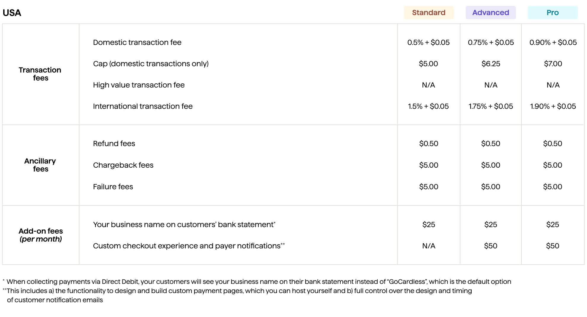 Each plan has a domestic and international transaction fee associated with the features and product it offers. The transaction fees apply to both successful and unsuccessful transactions.