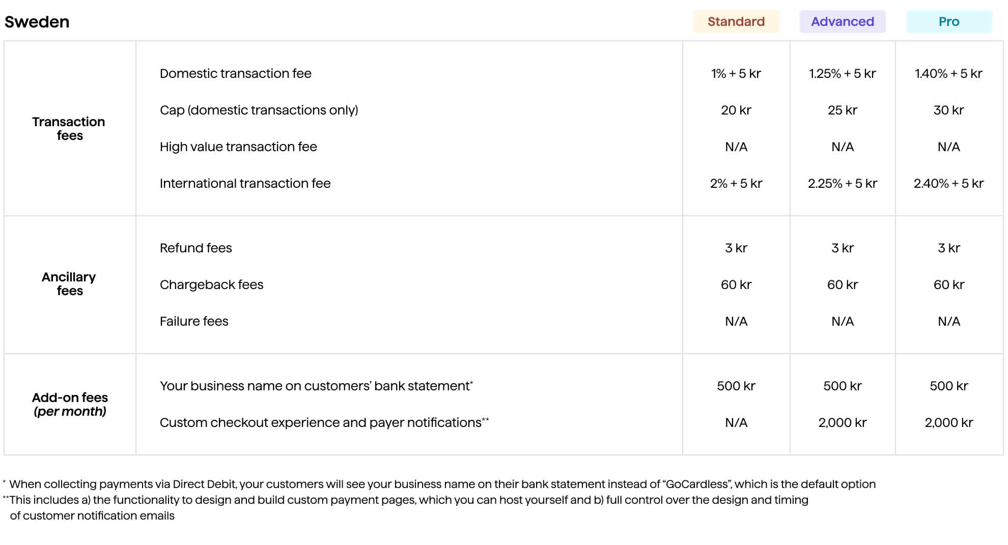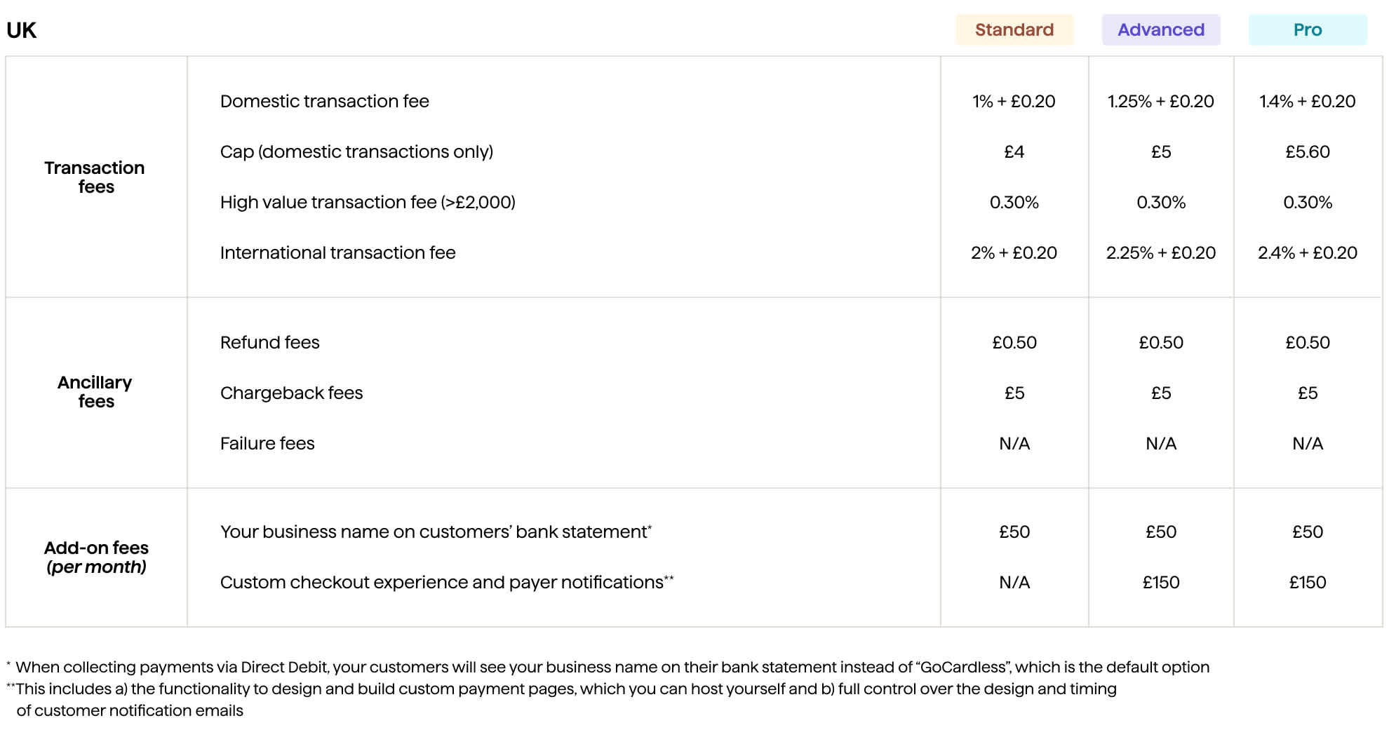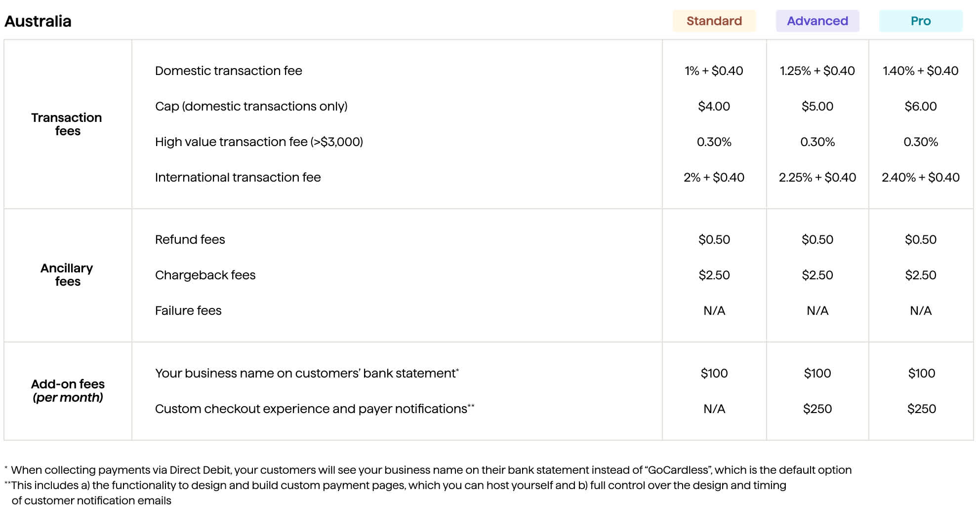 Each plan has a domestic and international transaction fee associated with the features and product it offers. The transaction fees apply to both successful and unsuccessful transactions.