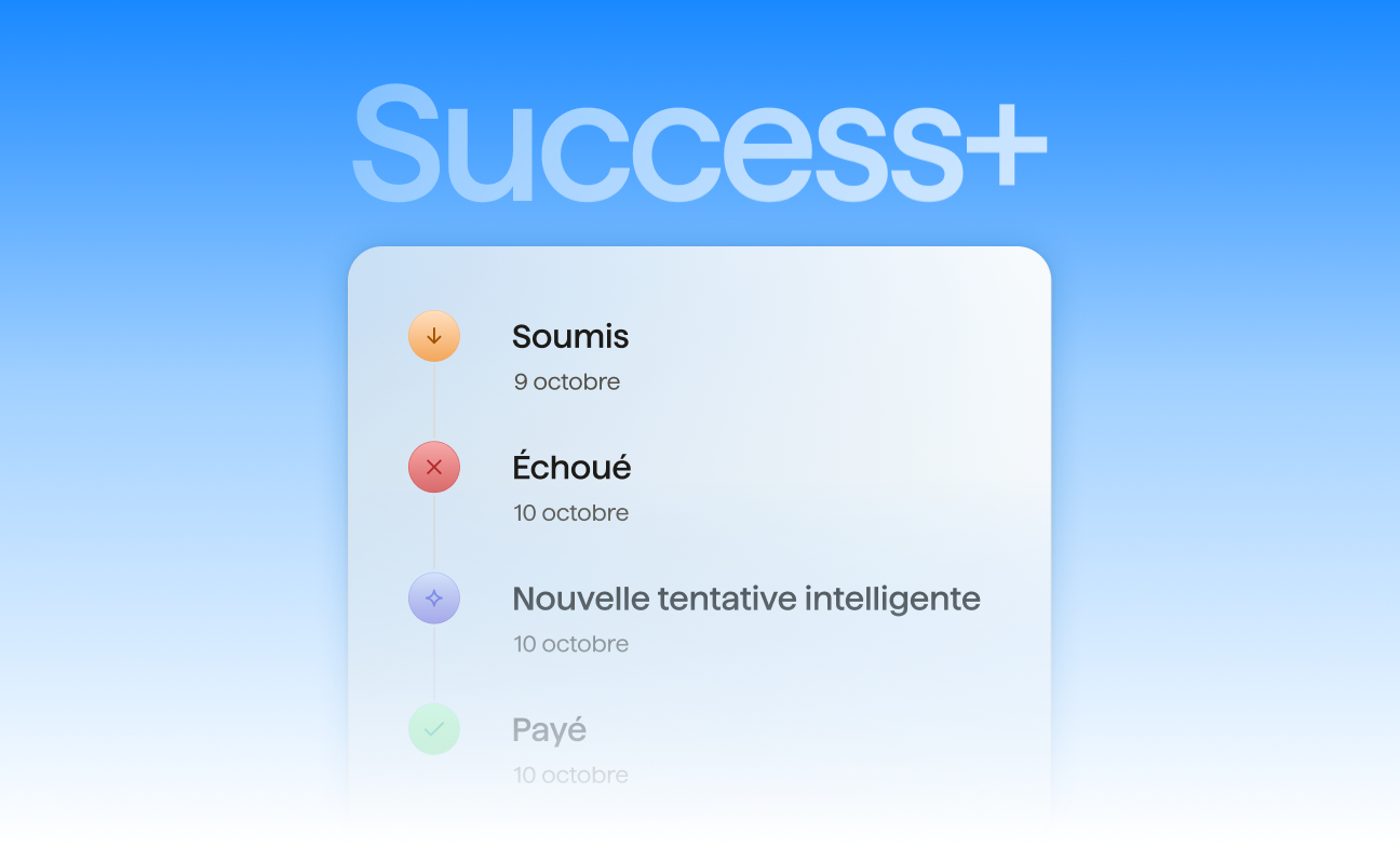 Prélevez 97,3 % des paiements avec succès dès la première tentative. Si un paiement échoue, détendez-vous. Success+ s'occupe des représentations intelligentes afin de prélever les paiements de vos clients au jour le plus adapté.