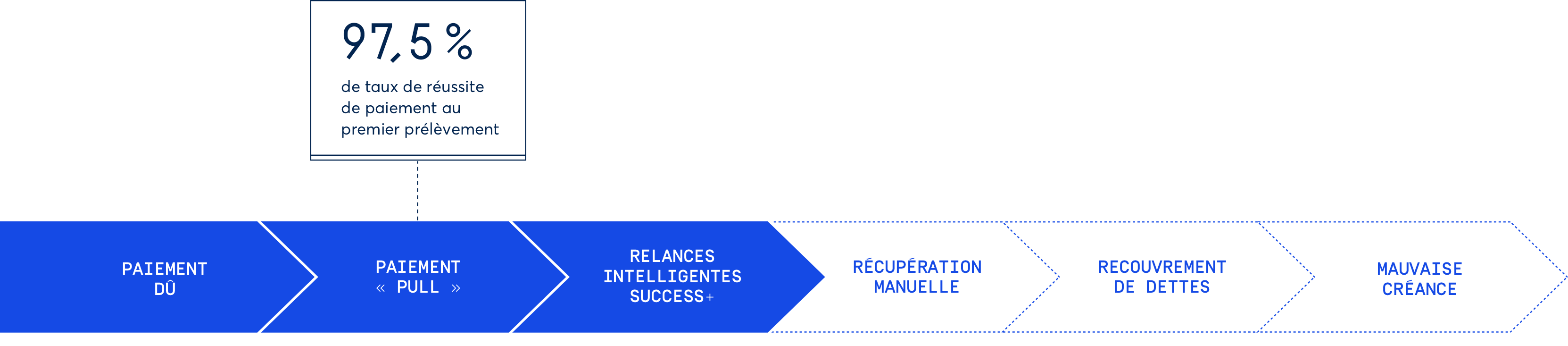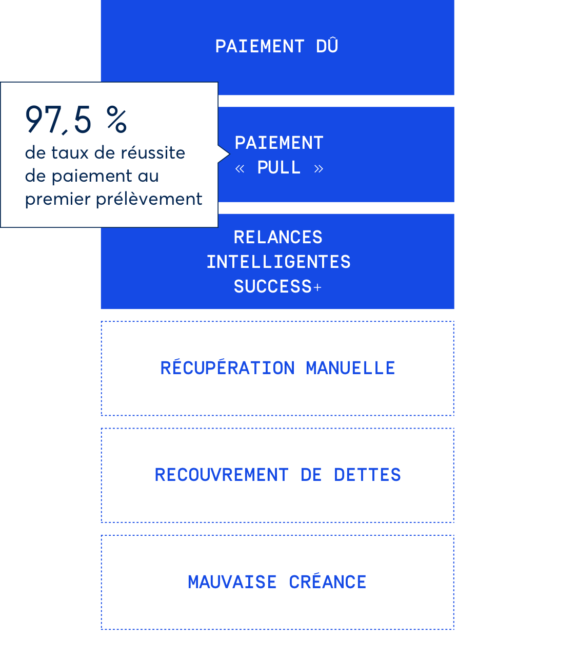 Le taux d’échec de paiement de GoCardless à la première tentative est d’environ 2,5 %. Optimisez encore davantage vos paiements avec Success+ pour relancer les paiements ayant échoué et obtenez un taux de réussite de 99,5 % !