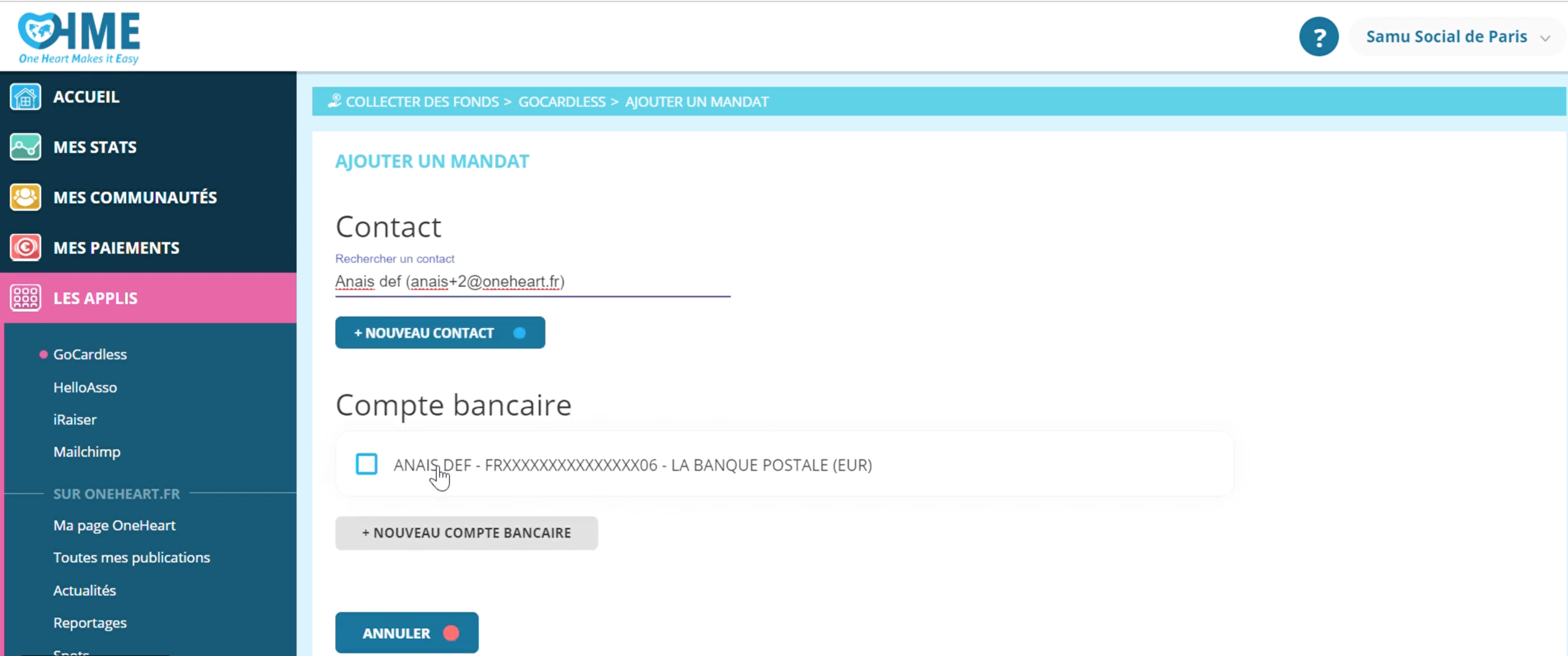 Vous pouvez créer directement de nouveaux mandats et de nouveaux engagements GoCardLess sur OHME.