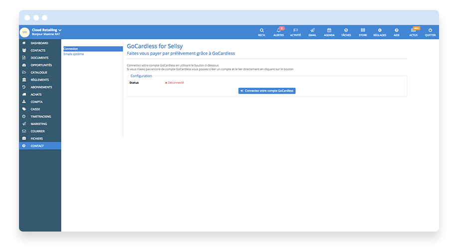 La connexion entre GoCardless et Sellsy se fait en quelques clics seulement. Il vous suffit d'activer le module (gratuit) sur Sellsy et d'ajouter vos identifants pour vous connecter.