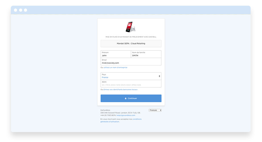 Sellsy utilise les pages de création de mandats créées par GoCardless. Vous n'avez donc aucune configuration à effectuer pour demander la création de mandat à votre client.