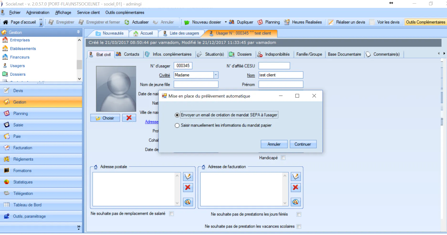 Depuis votre outil Sociel, créez vos mandats en ligne en envoyant une autorisation de prélèvement par email à vos clients ou enregistrez directement vos mandats papier. Les informations seront envoyées automatiquement à GoCardless.