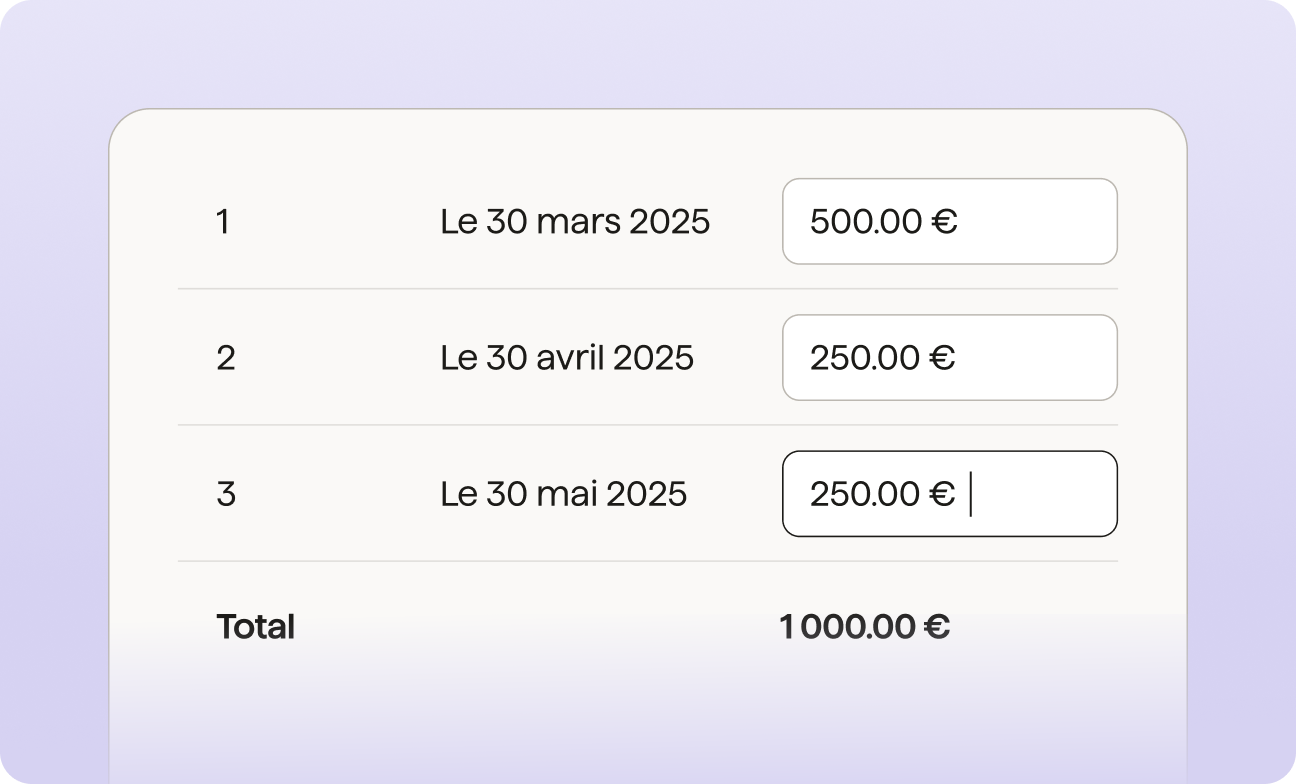 Avec GoCardless, vous pouvez prélever des paiements récurrents flexibles et offrir davantage de contrôle à vos clients, quelle que soit la fréquence : hebdomadaire, mensuelle ou trimestrielle. Par exemple, vous pouvez répartir un montant de 1 000 € en trois paiements mensuels : un premier versement de 500 €, les deux suivants de 250 €.