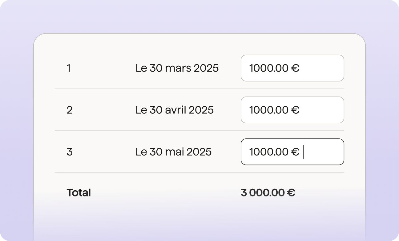 Avec GoCardless, vous pouvez diviser la somme à payer en échéances de même montant, par exemple : 3 000 € sur trois mois à raison de 1 000 € par mois. Une fois le plan de paiement terminé, les prélèvements s’arrêtent automatiquement.
