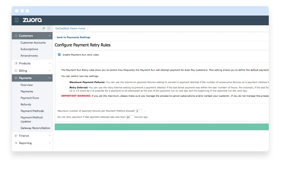 Retentez les paiements échoués et configurez vos règles de recouvrement sous le menu de configuration Z-Payments. Vous pouvez aussi rembourser en partie ou complètement les montants pour des paiements précédemment encaissés.