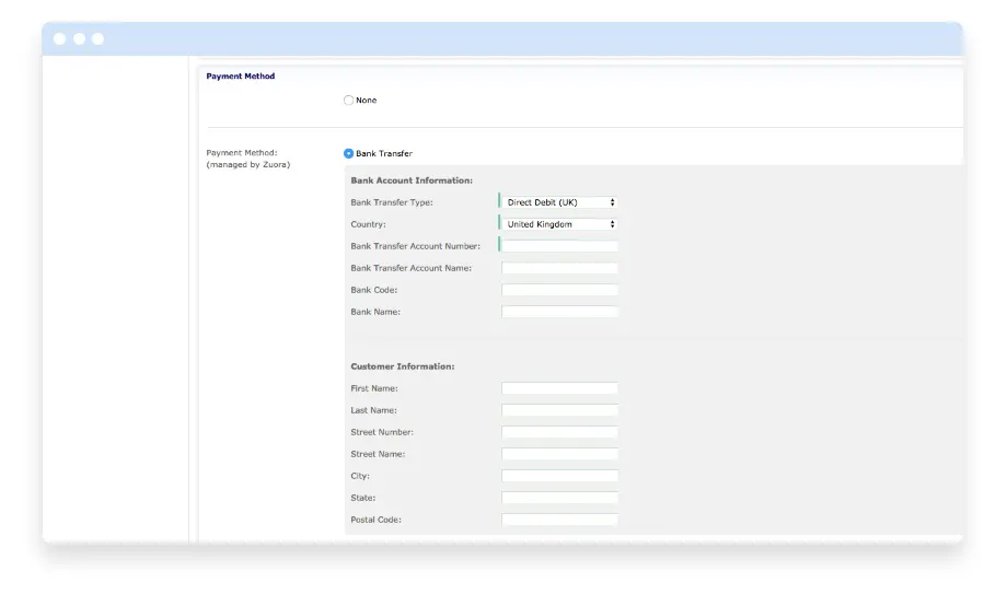Utilisez les pages de paiements hébergées par Zuora qui fonctionnent à travers l'Europe et le Royaume-Uni ou utilisez vos propres pages de paiement personnalisées depuis un CRM ou outil interne intégré à Zuora (les informationns seront alors transmises automatiquement dans Zuora).