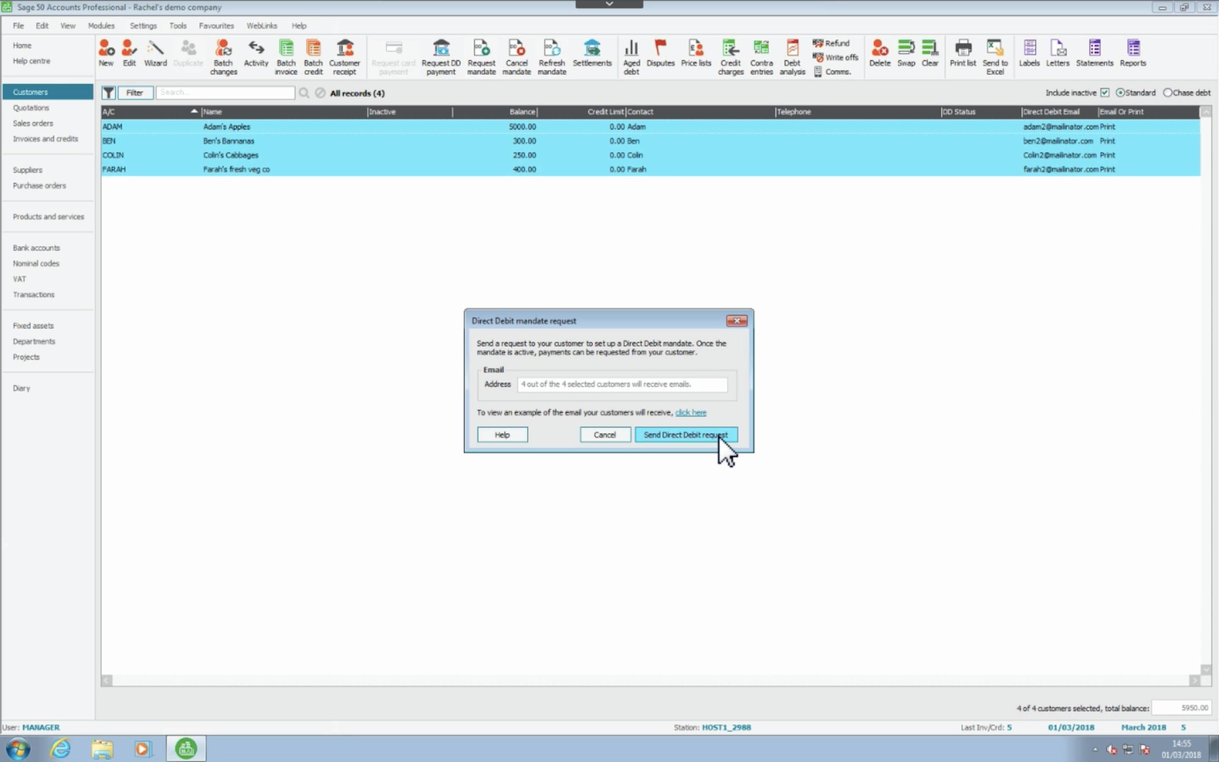 Select customers and choose Request Direct Debit on the main toolbar to select invoices for collection. Choose to collect in full or in instalments and customise due dates.