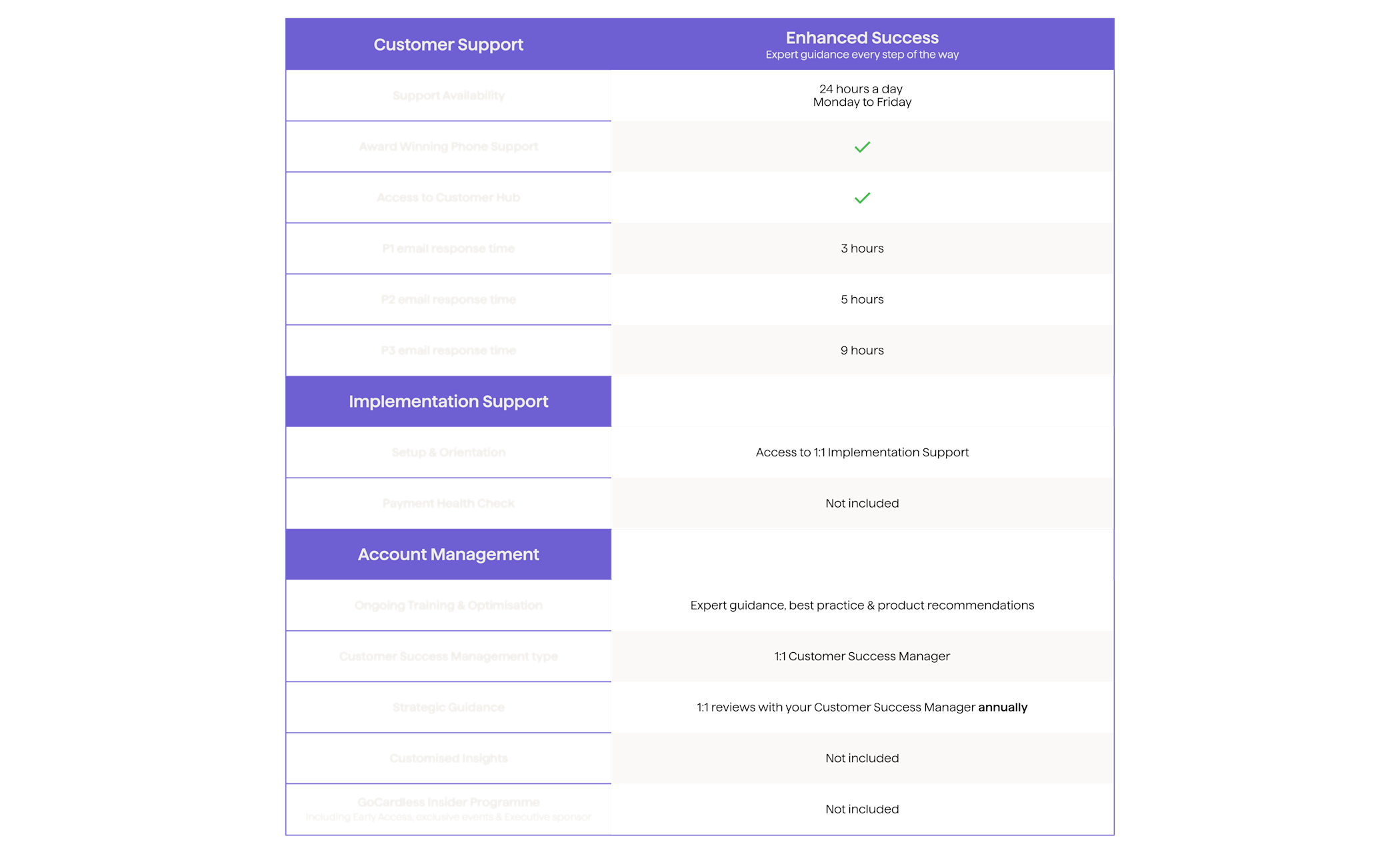 Enhanced Customer Success includes 1:1 access to your Customer Success Manager, who will be your dedicated point of contact throughout your journey with GoCardless. We’ll use our industry expertise to help you build your best practice approach - always guiding you through education and process optimisation.