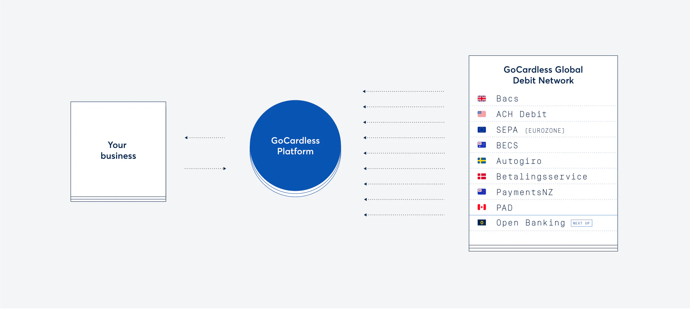 You can access a growing number of bank debit schemes via our network, and take recurring payments from customers around the world. At the moment, we can help you reach customers in the UK, the Eurozone, Sweden, Denmark, Australia, New Zealand, the US, and Canada.